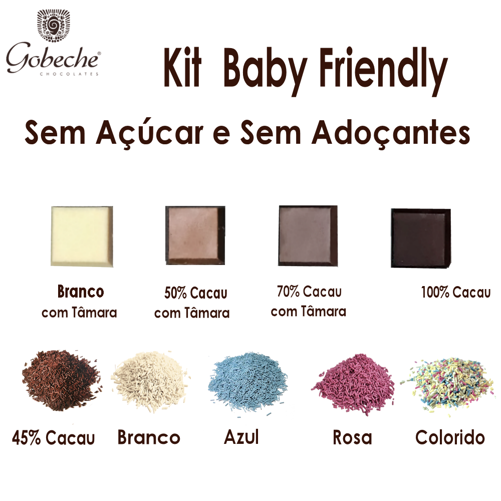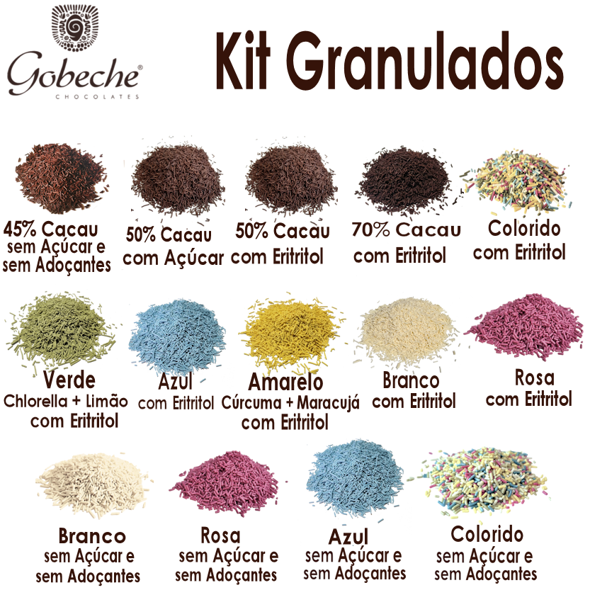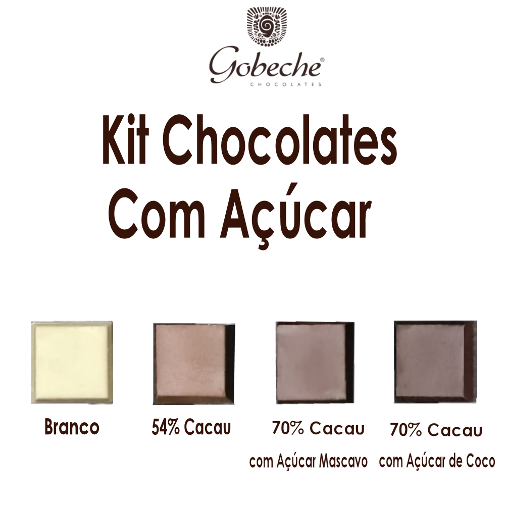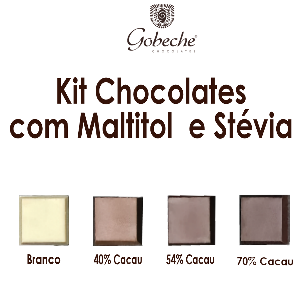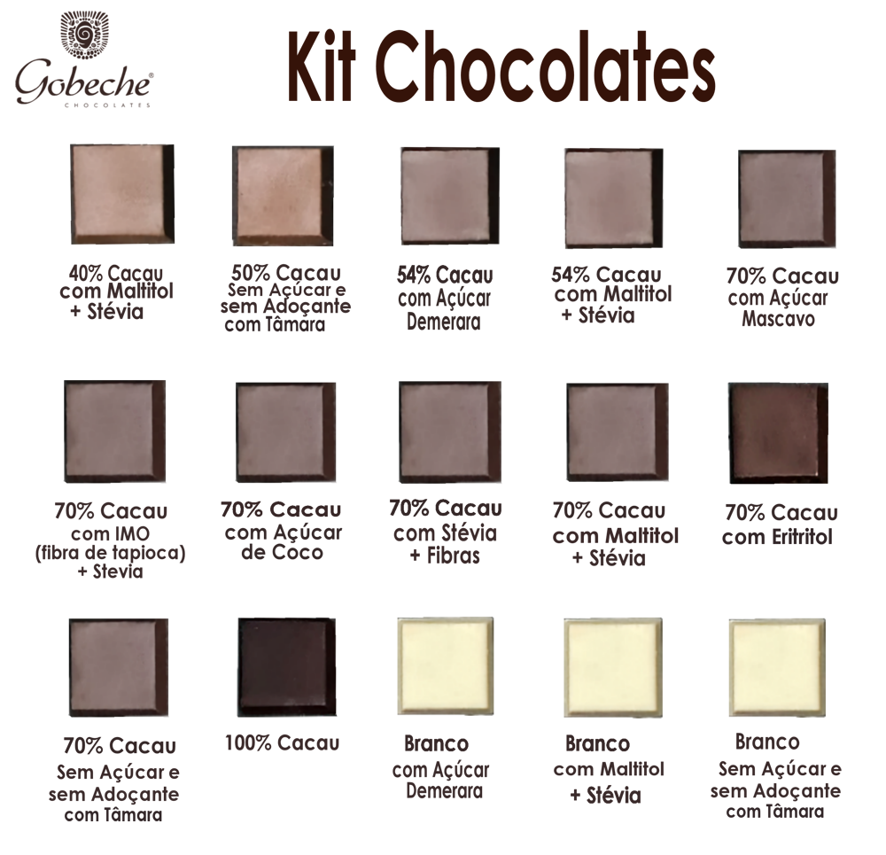 Kit contendo 48g das coberturas nas opções: Meio Amargo adoçado com Açúcar, Meio Amargo adoçado com Maltitol, Meio Amargo Sem Açúcar e Sem Adoçante, Branca adoçada com Açúcar, e Branca adoçada com Maltitol.